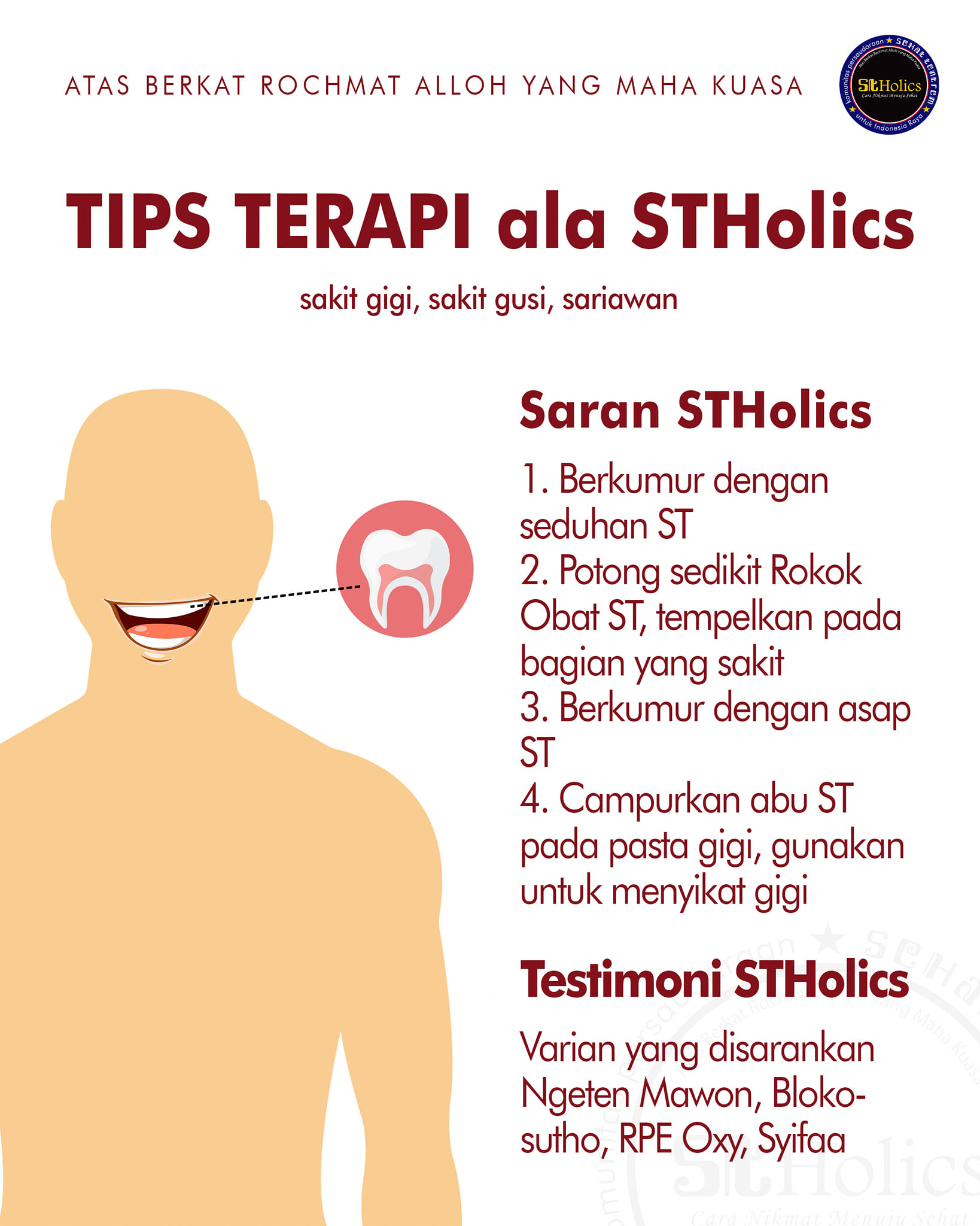 Hal senada pun dilakukan oleh STHOLICS dalam melakukan terapi pengobatan, selain prosesnya seperti biasanya dihisap, dari rasa memang sehat tentrem memiliki ciri khas yang menonjol. Metode terpai yang sering gilakukan salah satunya seperti gambar dibawah ini